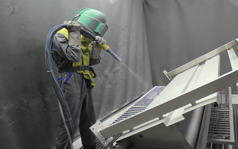 Cấu kiện sau khi gia công được chuyển sang khu vực vệ sinh. Tại đây các cấu kiện được vệ sinh, đánh gỉ bề mặt và xử lý bằng máy phun bi thép trước khi chuyển sang công đoạn sơn.