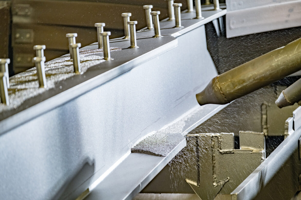 Cấu kiện sau khi gia công được chuyển sang khu vực vệ sinh. Tại đây các cấu kiện được vệ sinh, đánh gỉ bề mặt và xử lý bằng máy phun bi thép trước khi chuyển sang công đoạn sơn.